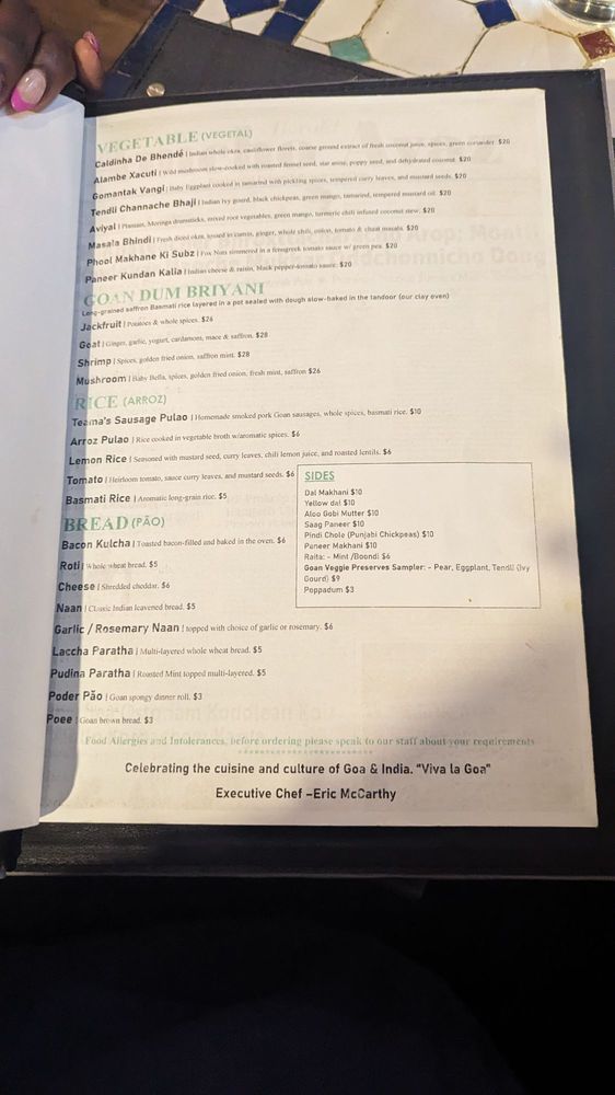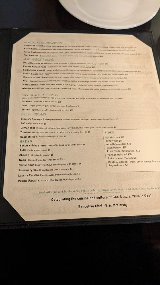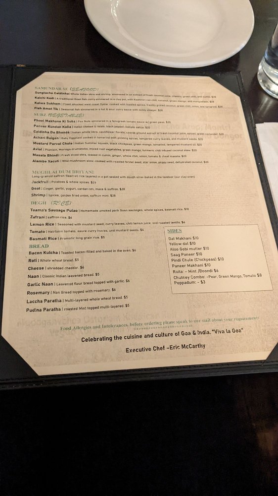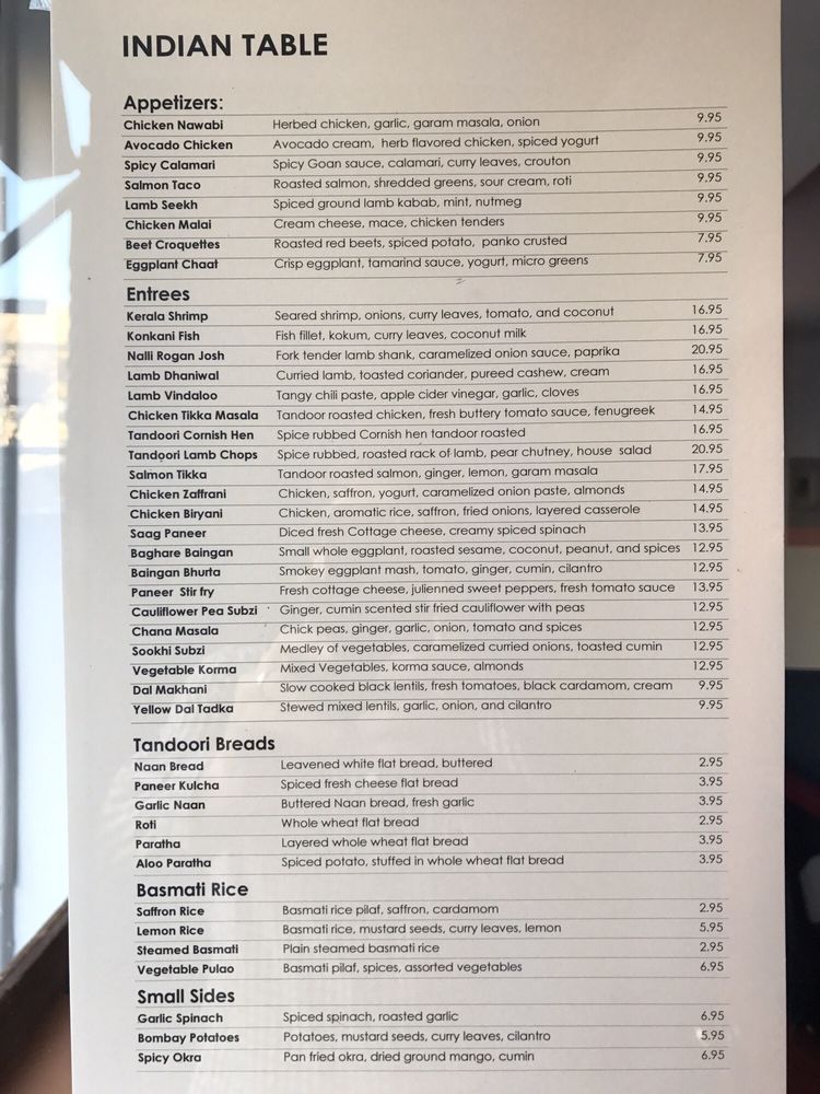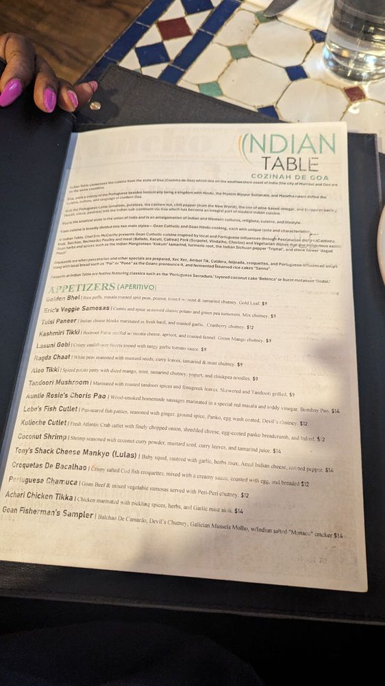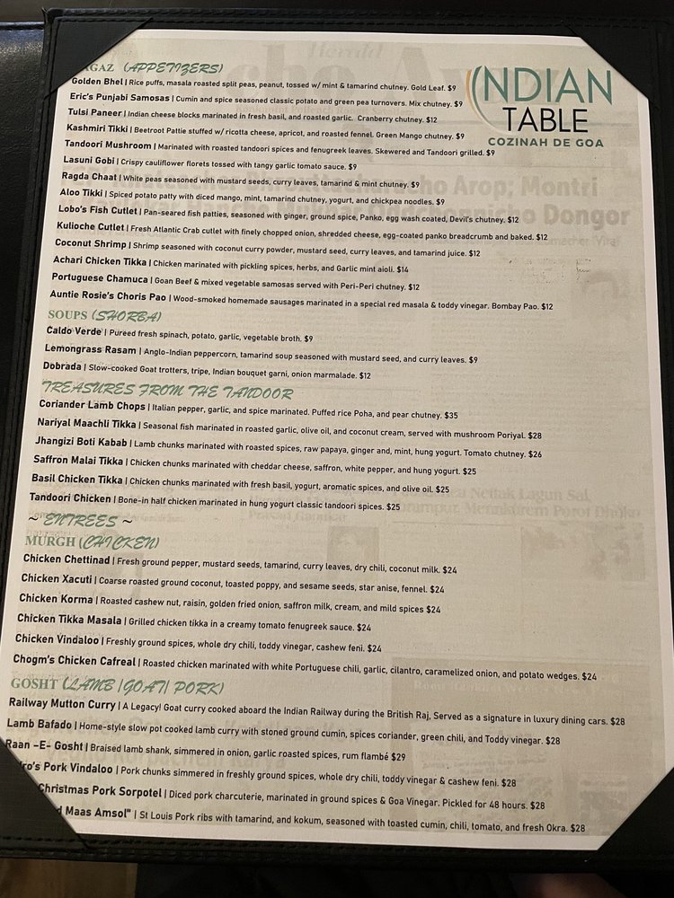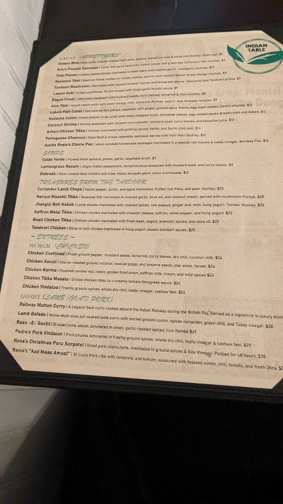 Indian Table, located in Brooklyn, NY, offers a unique dining experience with a focus on Goan cuisine and a variety of feni-based cocktails. The menu features a mix of Americanized North Indian dishes and traditional Goan specialties, catering to both meat lovers and vegans. Dishes like the spinach soup, okra/cauliflower curry, and Portuguese Chamuca appetizer have received rave reviews for their bold flavors. Customers also praise the attentive service and cozy outdoor seating area. The butter chicken, lamb briyani, and Aloo Tiki sides are standout dishes that showcase the restaurant's commitment to quality and authenticity. Indian Table is a must-visit for those looking to explore the diverse flavors of Indian cuisine in a stylish and inviting setting.