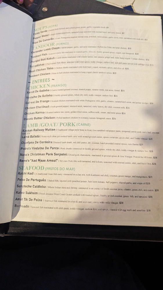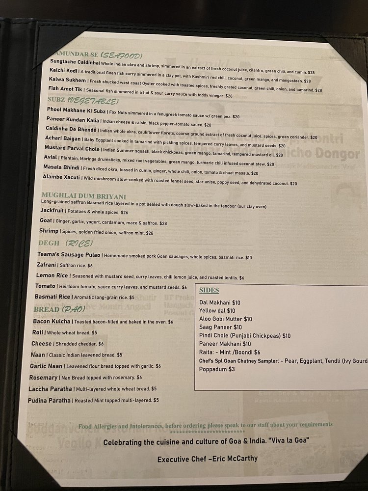 | Traditional village-style bone in Goat, Goa sundried red pepper paste, tempered cumin seed, curry leaf, coconut milk.